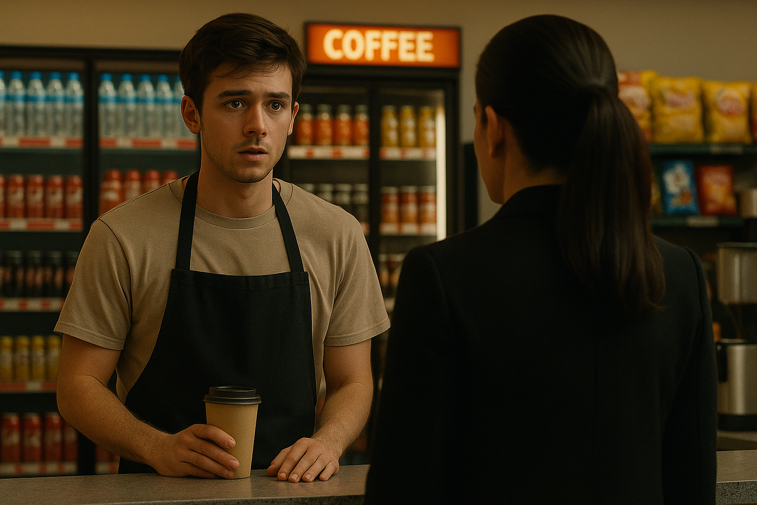 Der Kassierer, Anfang zwanzig, nervös, stellte den Kaffeebecher ab.