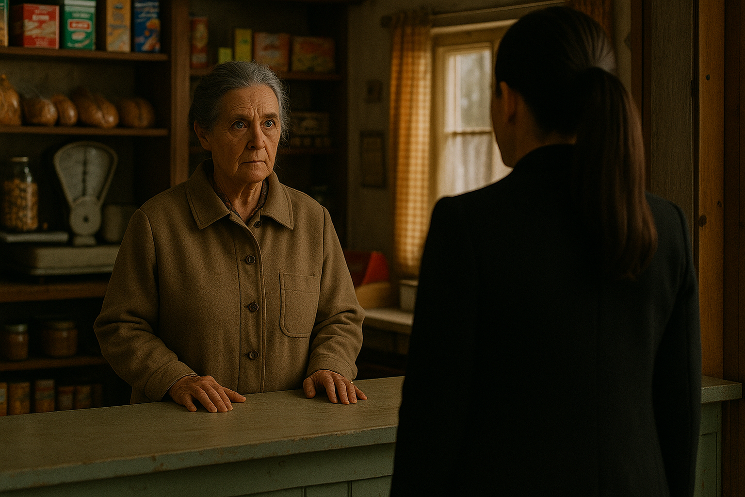 Hinter der Theke stand eine ältere Frau mit grauem Dutt, der Blick vorsichtig, abwartend.