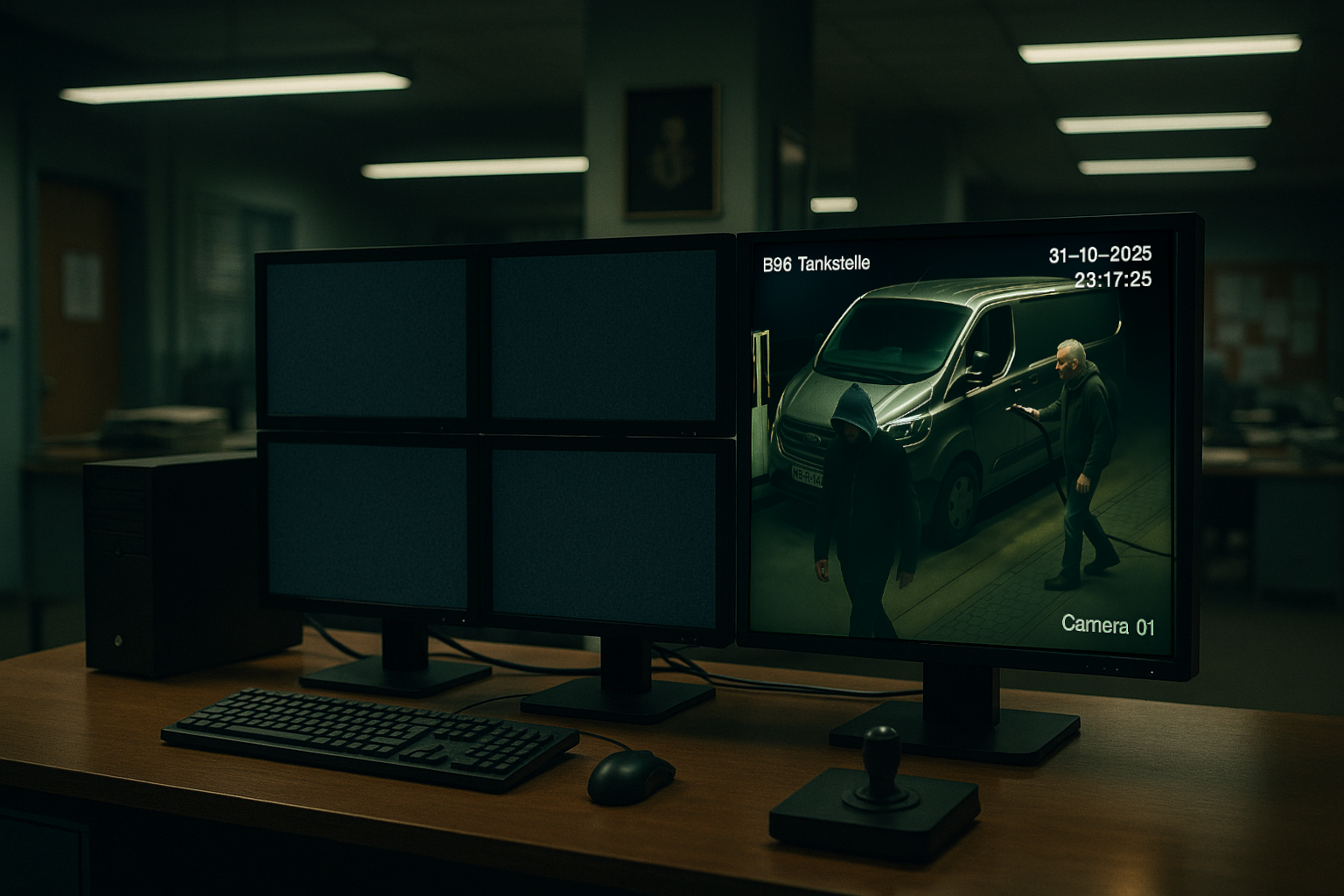 Kühn trat ins Bild, Tankrüssel in der Hand. Er wirkte ruhig, konzentriert. Dann – auf Sekunde 17 – kam ein zweiter Mann ins Bild. Dunkle Jacke, Kapuze tief ins Gesicht gezogen. Er sprach kurz mit Kühn, stieg anschließend auf der Beifahrerseite ein.