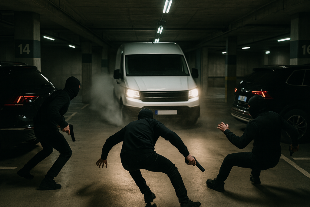 Noch ehe sie den Wagen starten konnten, dröhnten Motorengeräusche durch die Garage. Zwei schwarze SUVs blockierten den Ausgang, Männer sprangen heraus – dieselben maskierten Gestalten wie zuvor.