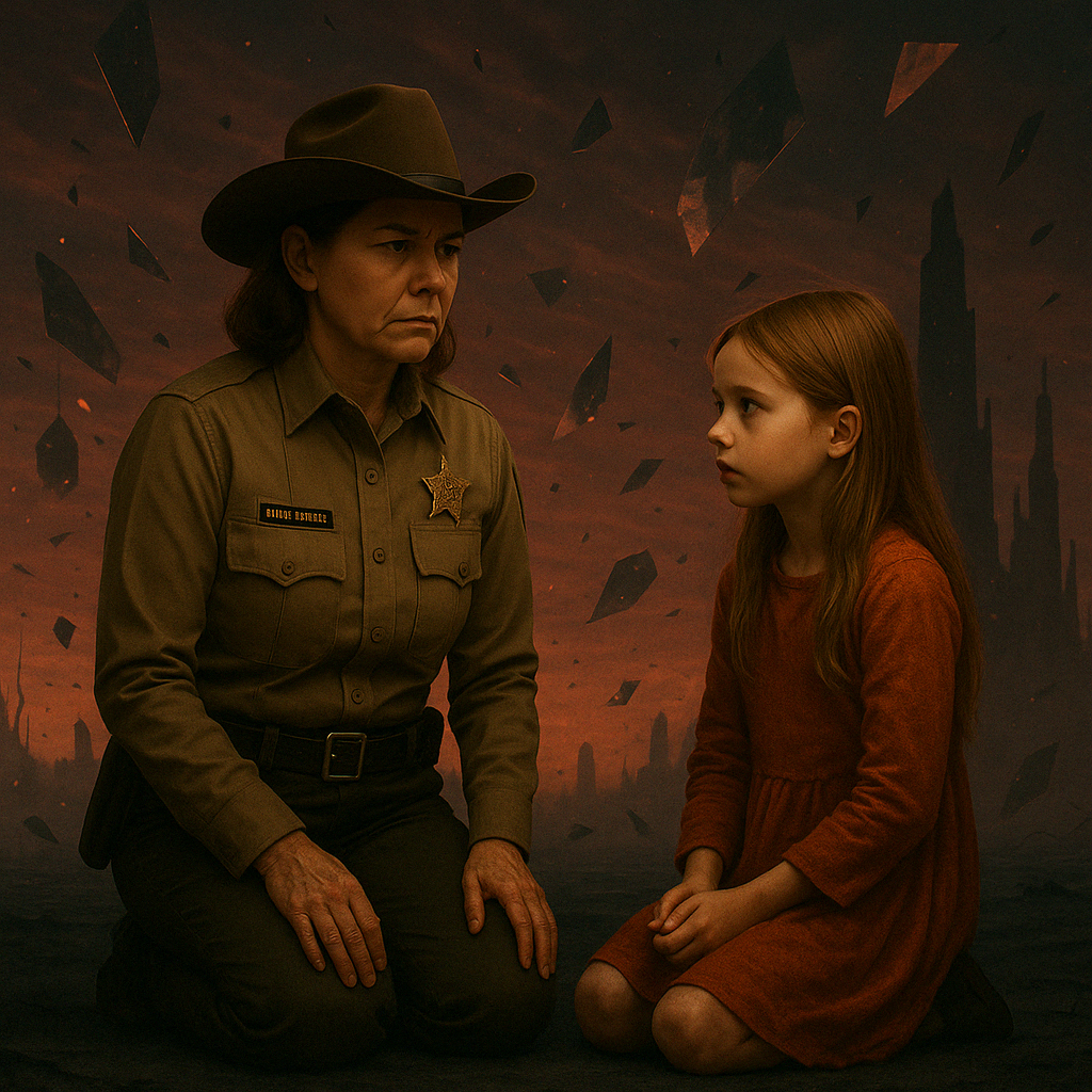Über ihr wölbte sich ein fremder Himmel – nicht Tag, nicht Nacht, sondern wie eine blutunterlaufene Dämmerung, die sich nicht entscheiden konnte. Schwarze Türme ragten in der Ferne empor, schief, als wären sie in Zeitlupe zusammengebrochen. Über dem Boden schwebten Splitter – von Spiegeln, von Häusern, von Erinnerungen. Ein Schweben zwischen Traum und Alptraum.