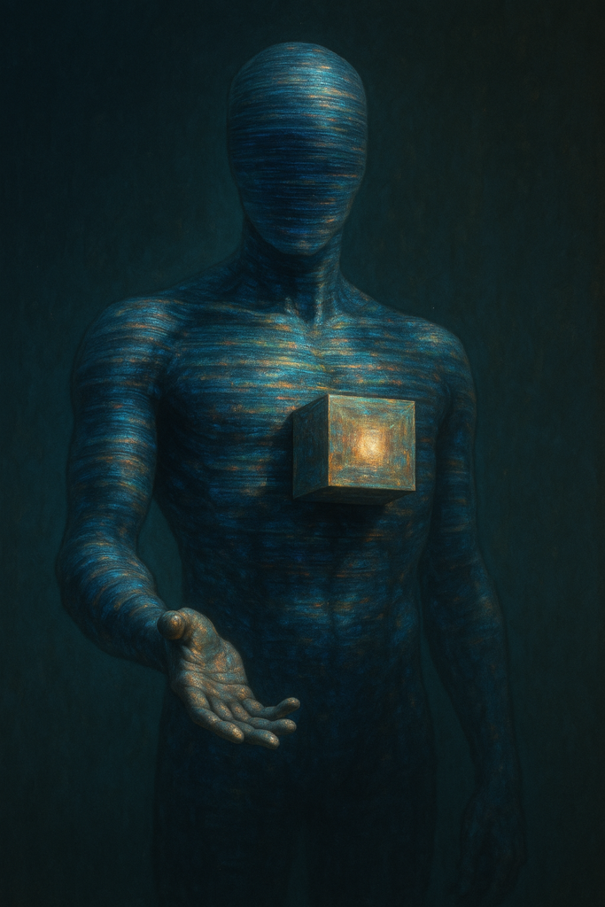Ein Wesen, groß wie ein Mensch, aber ohne Gesicht. Sein Körper bestand aus schimmernden Schichten – als würde man durch einen lebenden Bildschirm blicken. Aus seiner Mitte ragte ein Würfel – eingewachsen in den Brustkorb. Es sprach nicht. Es streckte ihr langsam die Hand entgegen.