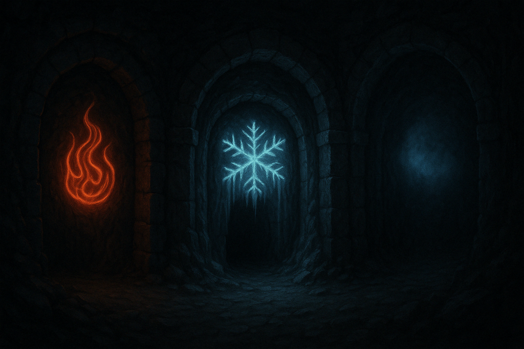 Der Tunnel war nun verzweigt. Drei neue Gänge führten in verschiedene Richtungen. Jeder von ihnen markiert mit Symbolen, die sich vor ihren Augen bewegten, als würden sie atmen. Einer brannte rot. Einer war von Eis überzogen. Und der dritte – pulsierte schwach in einem fahlen Blau.