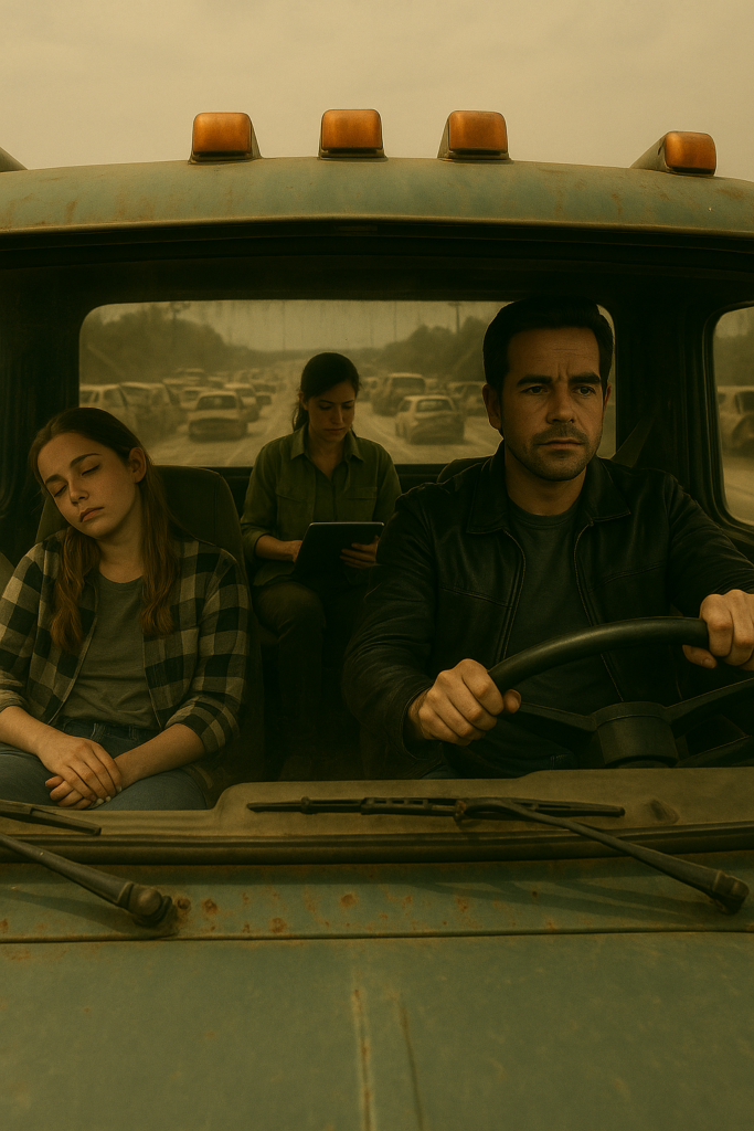 Drei Tage später ratterte ein alter Freightliner über einen Highway voller Autowracks.