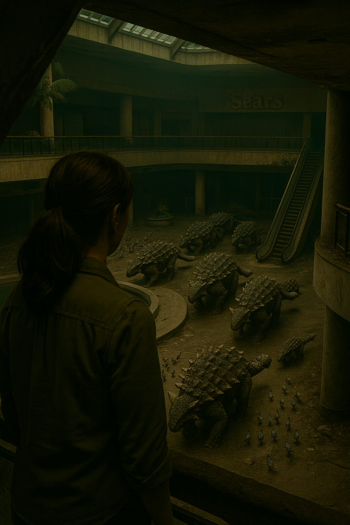 Sie krochen an die Kante der Galerie. Unten im Atrium, zwischen Springbrunnen und Rolltreppen, zog eine Reihe massiger, gepanzerter Leiber vorbei. Ankylosaurier, die Schwänze wie Morgensterne. Hinter ihnen, in respektvollem Abstand, eine Schar kleinerer, schnatternder Kreaturen, die die Reste aufsammelten.
