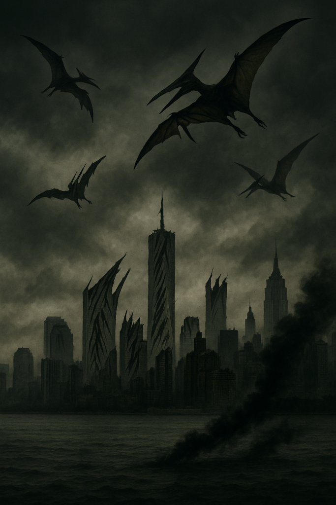 Zwei Wochen später lag Manhattan wie eine Fossilie unter Wolken. Von New Jersey aus sah die Skyline aus, als hätte sie jemand fotografiert und dann mit Klauen zerschnitten. Flugsaurier hingen wie Fetzen in der Thermik, Ruß wehte über den Hudson.