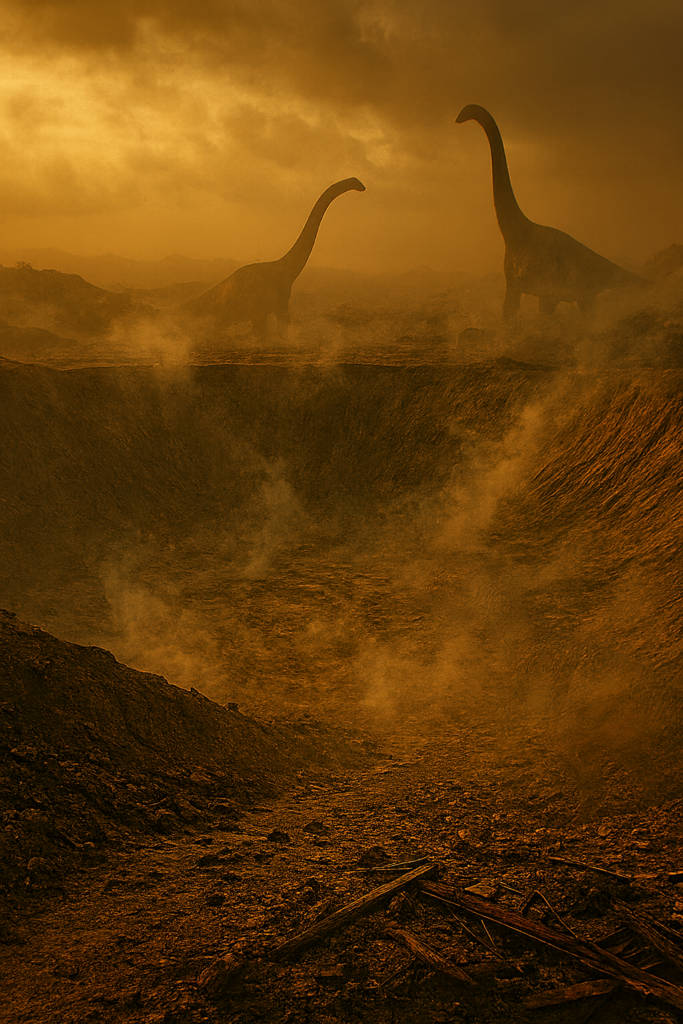 Über ihnen bewegte sich plötzlich etwas Großes. Der Boden vibrierte, Steine lösten sich. Ein Sauropode senkte den Kopf in den Krater, die Augen schwarz wie Teer. Langsam drehte er sich in ihre Richtung – nicht aggressiv, nur neugierig.