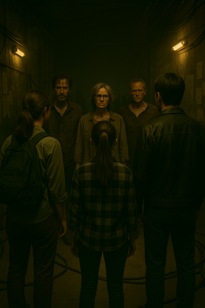 Bevor Lena antworten konnte, hörten sie Schritte. Drei Gestalten traten aus dem Schatten – Überlebende in zerrissene Kleidungen.