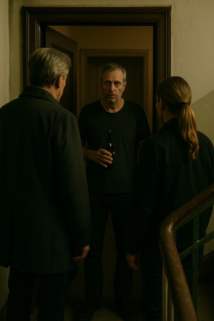 Die Adresse führte sie in eine Hinterhofwohnung in Friedrichshain. Die Klingel war verblasst, der Name kaum noch lesbar: Schulze. Als die Tür aufging, stand ein Mann Mitte fünfzig vor ihnen, mit eingefallenen Wangen, grauen Stoppeln im Gesicht und einer Flasche Bier in der Hand.