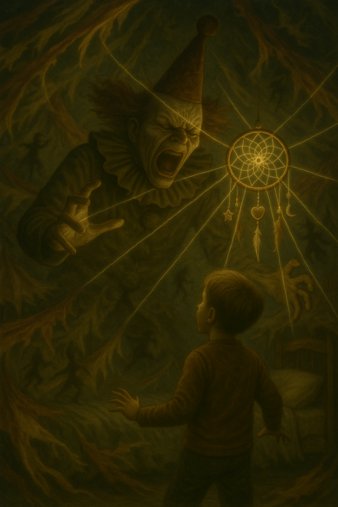Der Clown schrie, seine Gestalt flackerte. Der Traumfänger über Elias‘ Kopf begann zu leuchten. Fäden aus Licht schossen in den Raum, banden die Gestalt wie Spinnweben.