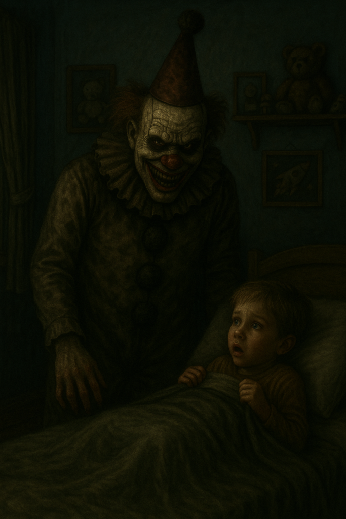 Im Haus des kleinen Elias, der am Spielplatz dabei gewesen war, war es still. Bis auf ein Knarren. Ein leises Rascheln. Und dann – eine kühle, unnatürliche Präsenz im Kinderzimmer. Elias öffnete langsam die Augen, blinzelte in die Dunkelheit … und sah ihn. Den Clown. Direkt neben seinem Bett. Das Grinsen war breiter als zuvor, seine Hände fast knochig, wie aus Leder und Dreck geformt.