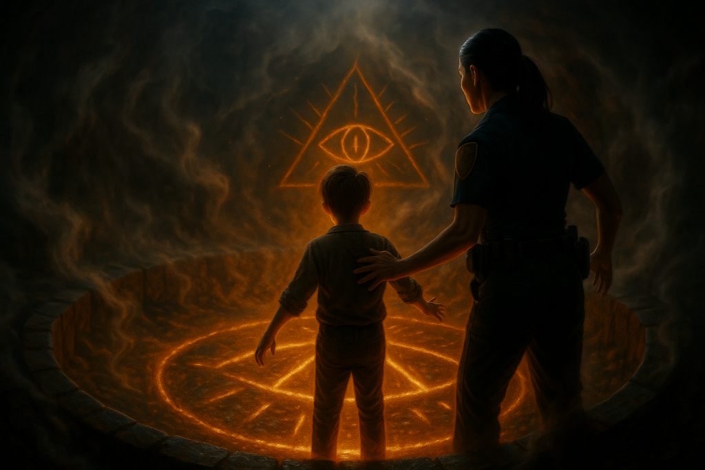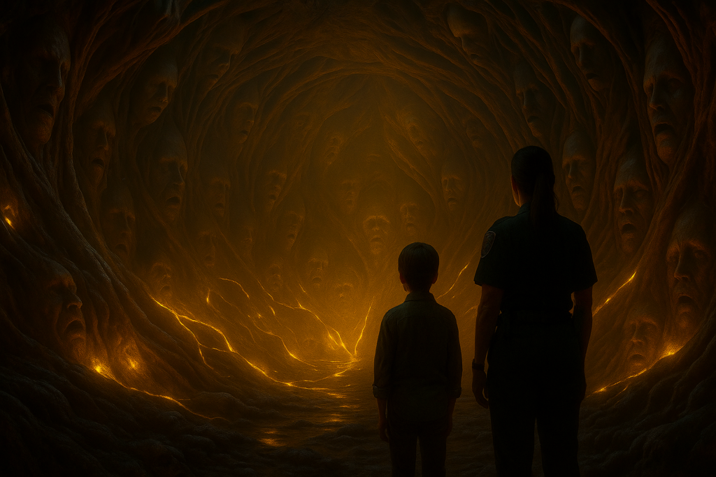 Die Wände um sie herum waren von Symbolen überzogen – dieselben Spiralen wie an der Tafel, aber älter, tiefer, leuchtend. Und zwischen den Linien lagen Dinge, die wie Gesichter aussahen. Menschliche Gesichter, eingefangen im Gestein, die Augen geöffnet, als würden sie schlafen.