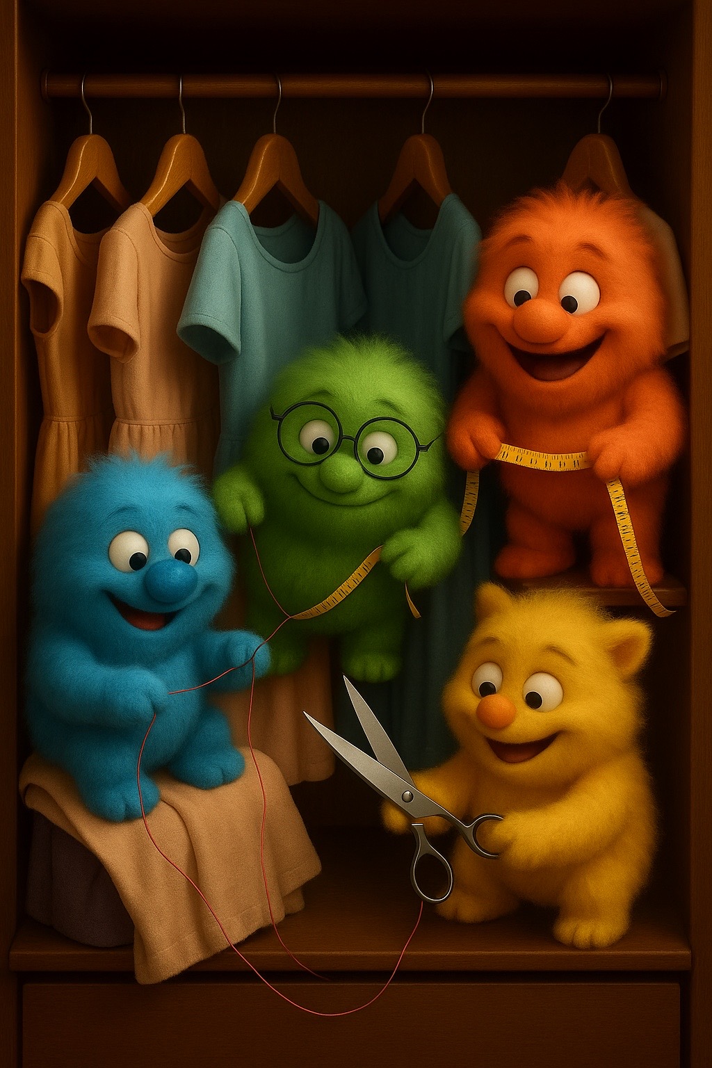 Eines Abends, als das Kind längst schlief, kletterten die vier aus ihrem Versteck. Zwischen den aufgehängten Kleidern entdeckten sie einen Riss in einem Lieblingskleid des Kindes. „Oh nein!“, rief Flauschi. „Das müssen wir sofort reparieren!“