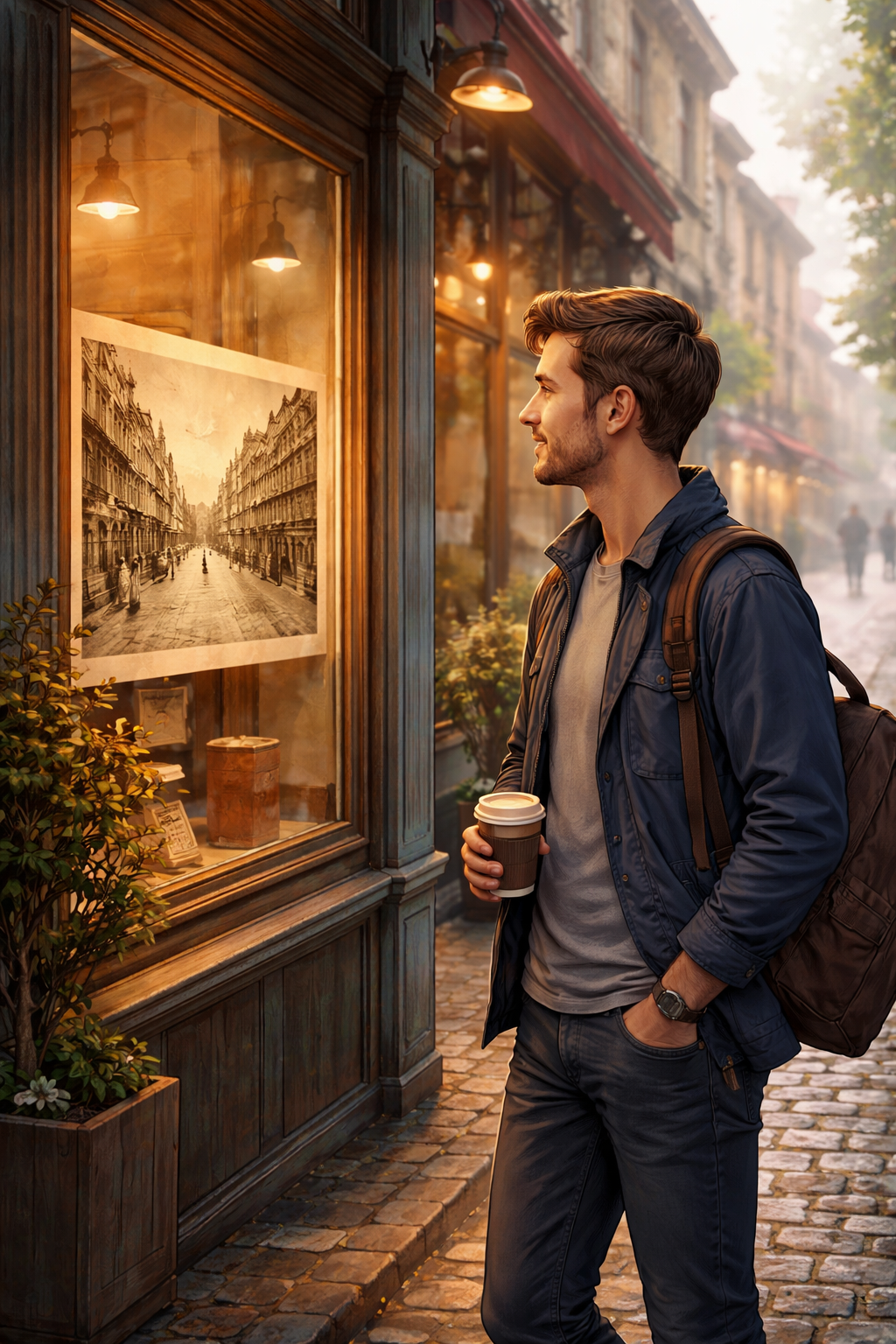 In einem kleinen Schaufenster entdeckte er etwas, das ihn überraschte: ein altes Foto. Es zeigte genau diese Straße – aber vor vielen Jahren. Ohne Autos, mit Kopfsteinpflaster und Menschen, die langsamer zu leben schienen. Jonas betrachtete es länger, als er eigentlich Zeit hatte.