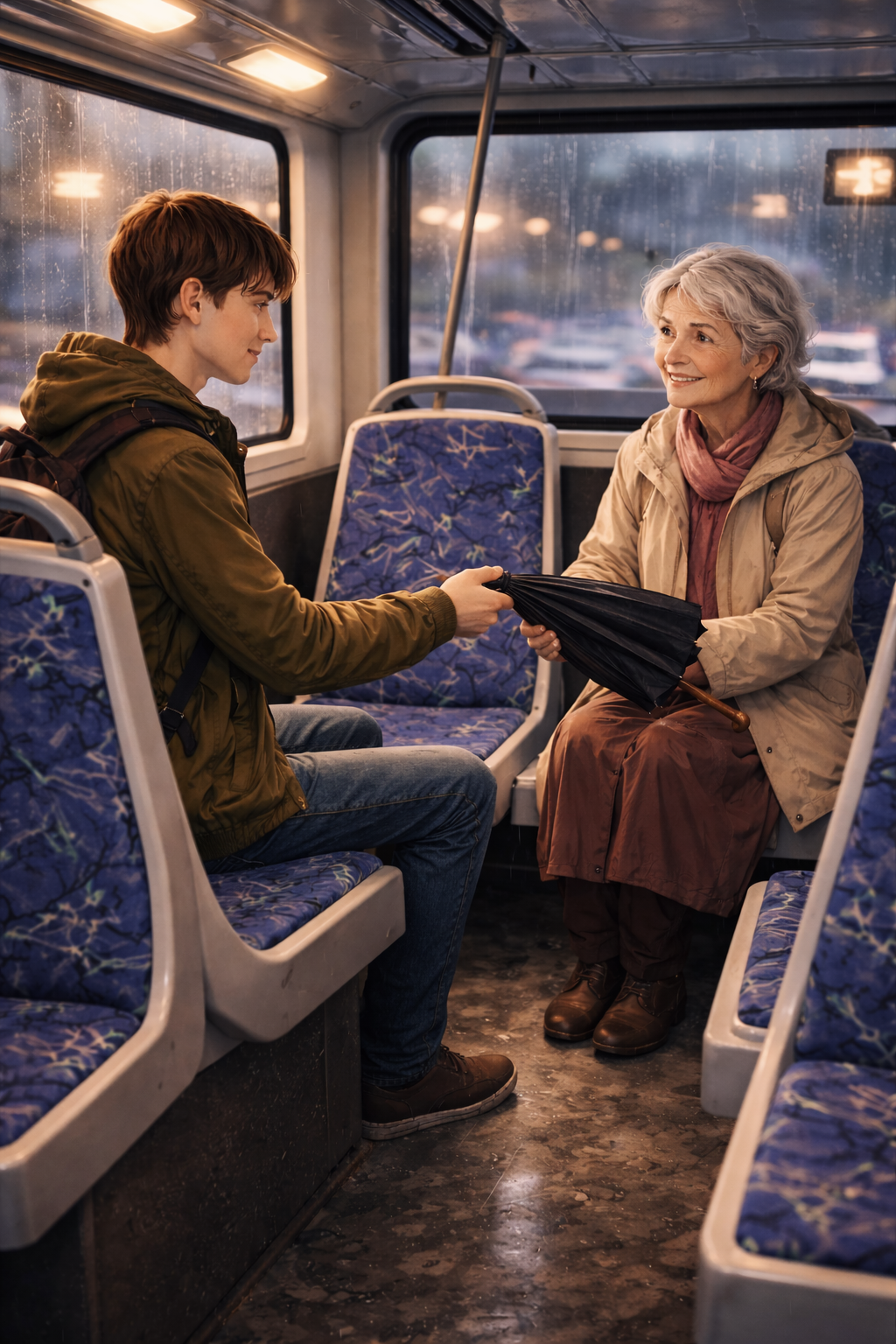 Als der Bus endlich kam, stiegen alle hastig ein. Tom setzte sich ans Fenster, den Schirm zwischen seinen Füßen. Die Scheibe war beschlagen, draußen verschwamm die Welt zu grauen Linien.