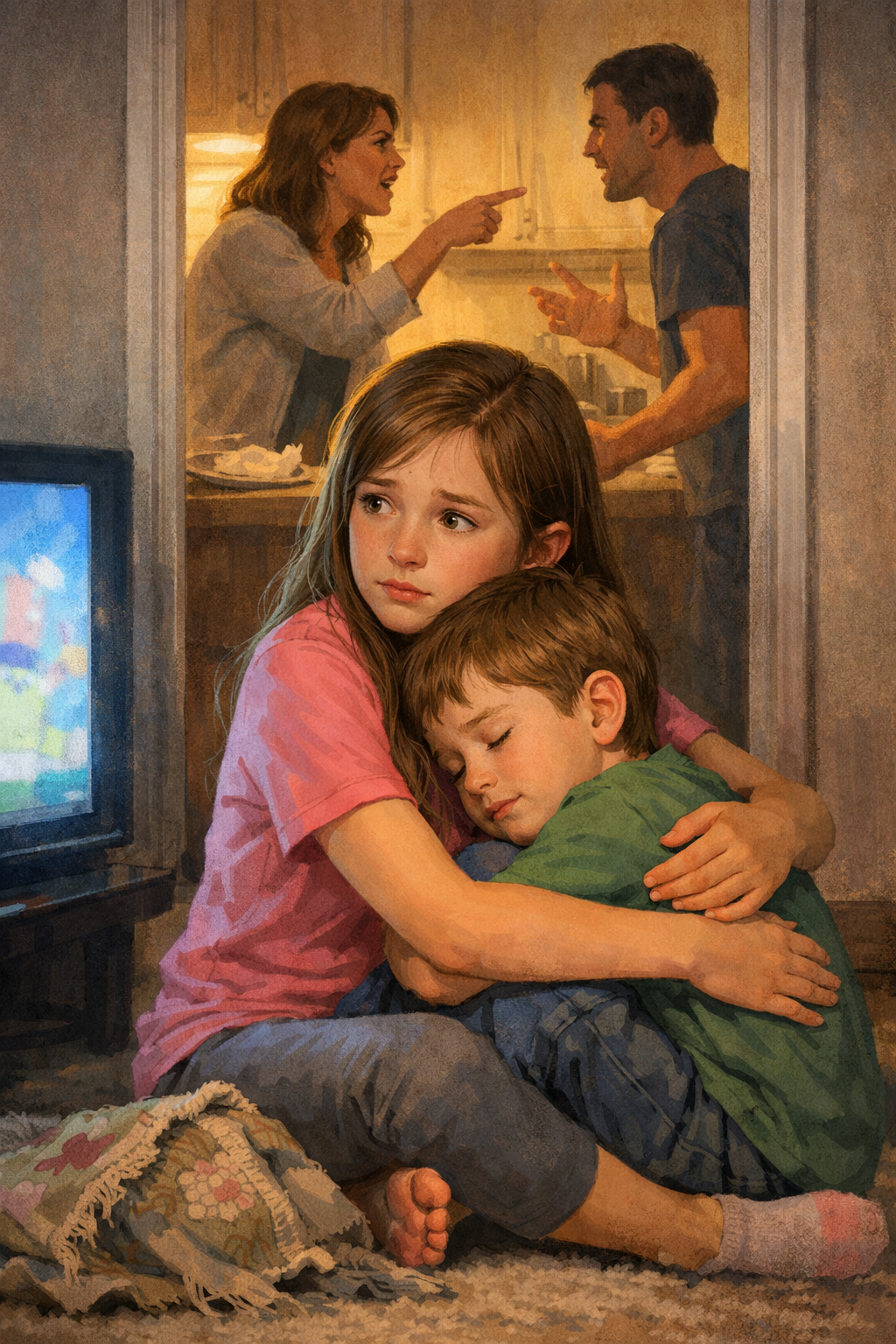 Lena saß auf dem Teppichboden und zog gedankenverloren die Fäden aus einer alten Decke. Neben ihr lag ihr kleiner Bruder Tom, der eigentlich längst hätte schlafen sollen. Doch an Schlaf war heute nicht zu denken.