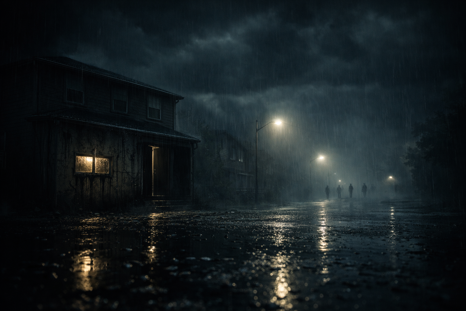 Die Straße lag im Halbdunkel. Die Laternen waren an, aber ihr Licht wirkte matt, kränklich, als hätte man es verdünnt. Der Regen fiel senkrecht. Kein Wind. Kein Zittern in den Bäumen.