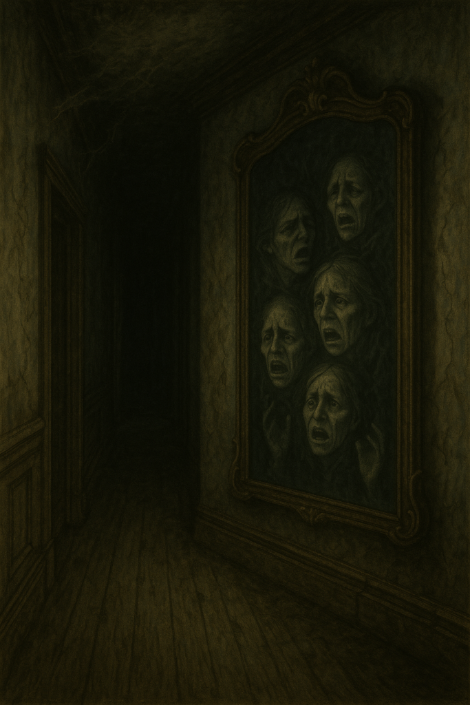 Am Morgen finden die Dorfbewohner das Haus leer. Kein Zeichen der Freunde, nur ein neuer, unheimlicher Spiegel an der Wand im Flur. Wer hineinsieht, erkennt die Gesichter der Vermissten – sie flüstern um Hilfe, doch ihre Stimmen hallen für immer im Haus.